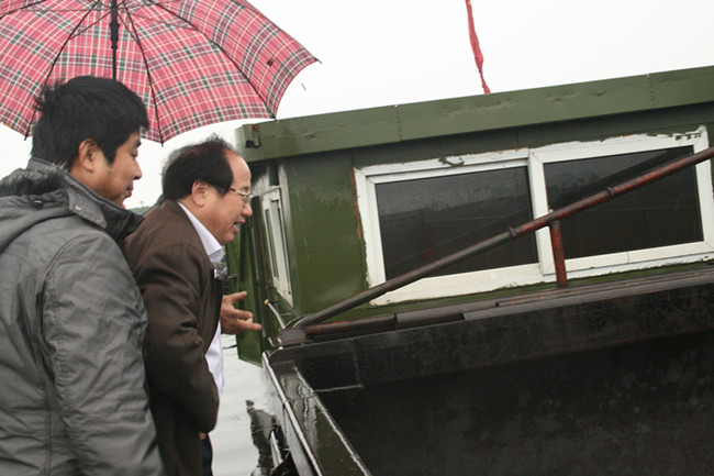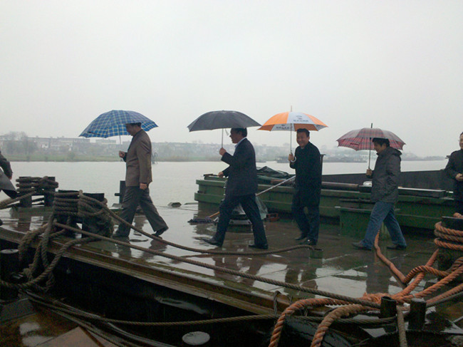 公司總經(jīng)理劉曹應(yīng)、副經(jīng)理徐經(jīng)恒等一行冒雨在駁船上檢查
