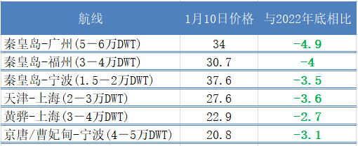 據(jù)煤炭江湖統(tǒng)計,1月份國內(nèi)沿海運費繼續(xù)下跌,各航線累計跌幅多在3-5元/噸之間。元旦過后新一年度煤炭長協(xié)合同開始兌現(xiàn),同時部分終端存在節(jié)前補庫需求,帶動市場新增貨盤釋放較節(jié)前有所增多,運輸需求略有改善。但多數(shù)終端庫存水平較高,疊加多行業(yè)年底提前放假,日耗季節(jié)性走弱,拉運迫切程度不高。