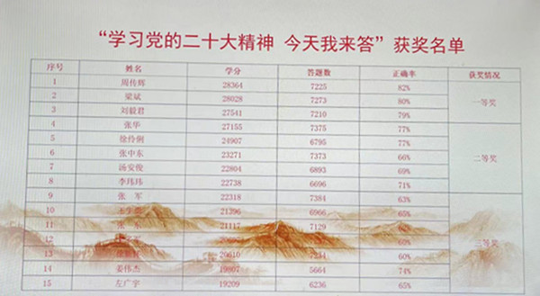 此次活動(dòng)公司黨委高度重視,對(duì)活動(dòng)參與方式、獎(jiǎng)勵(lì)等精心安排部署,并專門下發(fā)了《關(guān)于“學(xué)習(xí)黨的二十大精神 今天我來答”有獎(jiǎng)競答活動(dòng)的通知》。公司黨委要求各級(jí)領(lǐng)導(dǎo)干部帶頭參與,全體黨員積極響應(yīng),在崗黨員參與率達(dá)到了100%,學(xué)分在20000分以上的達(dá)到了13人。經(jīng)過100天的學(xué)習(xí)競答,評(píng)選出一等獎(jiǎng)3人,二等獎(jiǎng)5人,三等獎(jiǎng)7人。